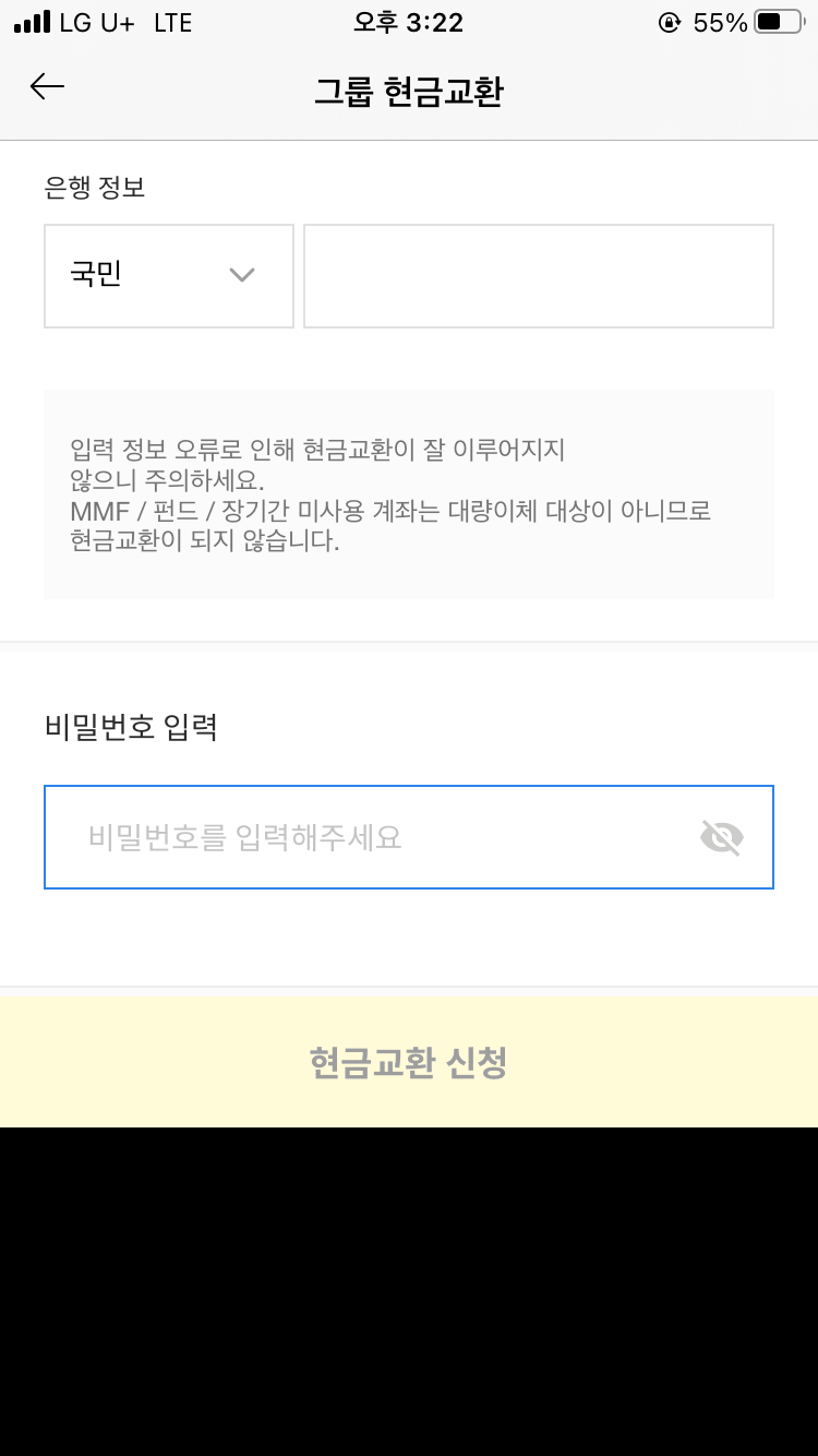*참고로 이 앱 제대로 작동하지도 않아서메인 화면에서 '그룹현금교환' 눌러서 진행하면 교환버튼이 안 뜹니다. 그룹지갑에서 현금교환으로 들어가주세요!