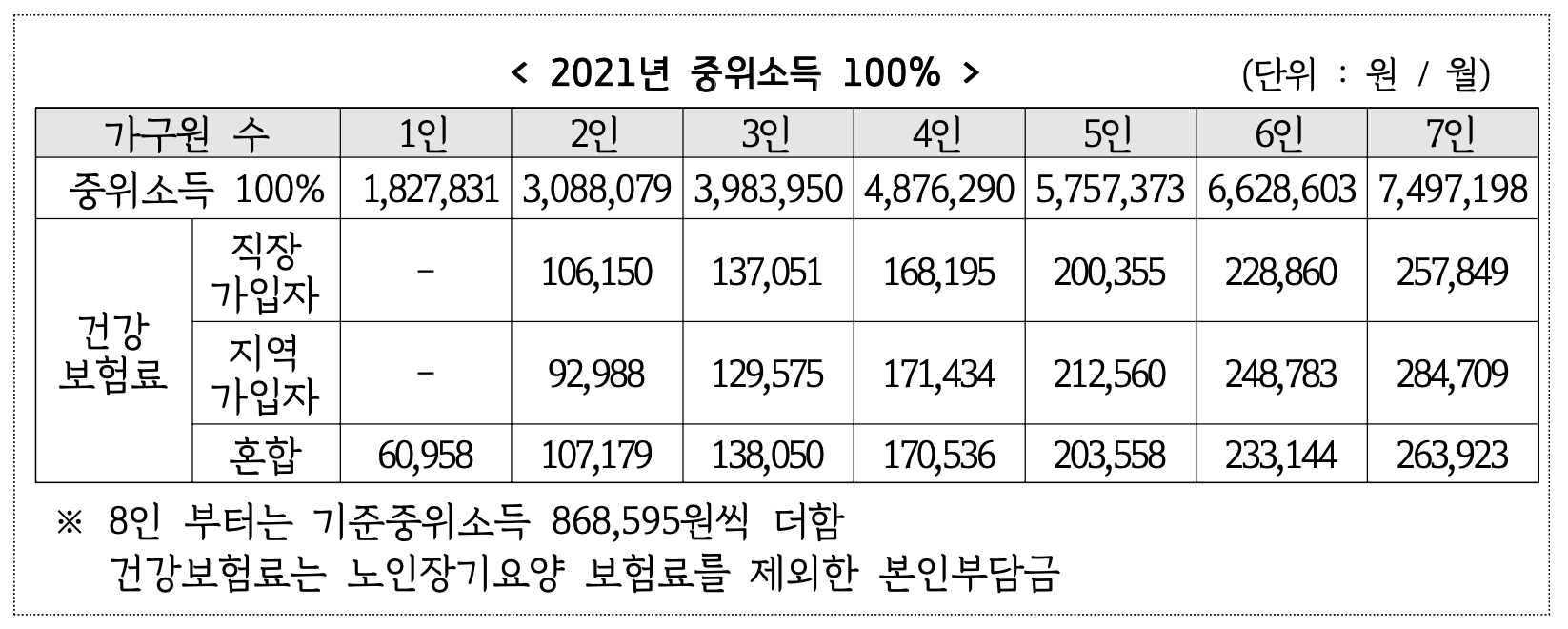 - 기준 중위소득 100% 이하 (중위소득 기준은 아래 표를 참고하세요.)