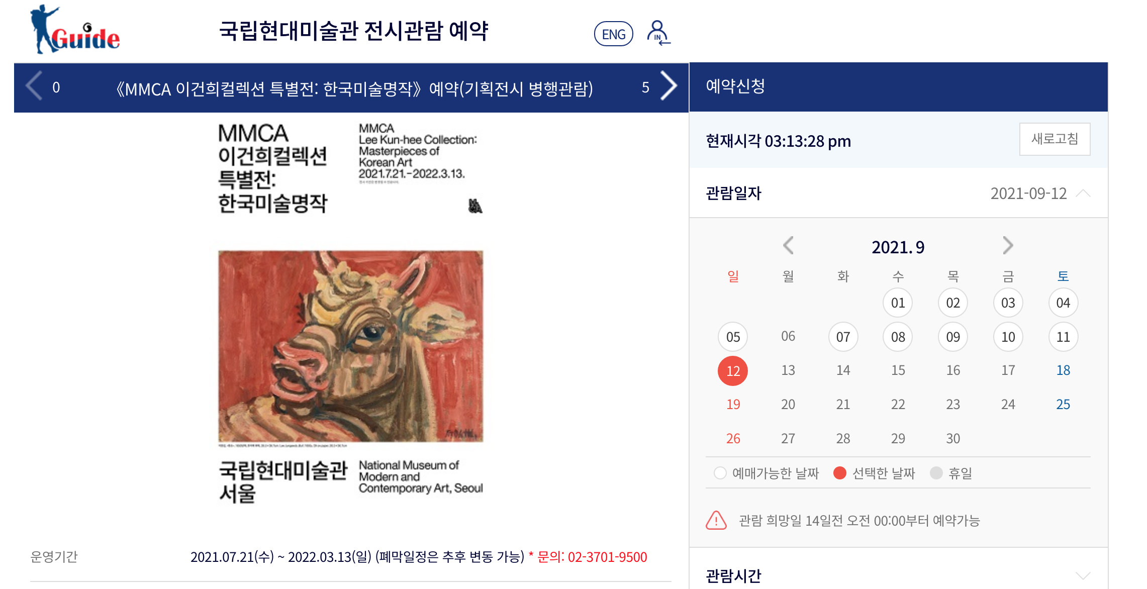 전에 포스팅한 국립중앙박물관에서는 보름치를 몰아서 티켓팅 했는데요. 국립현대미술관에서는 하루하루 티켓이 열립니다. 국립중앙박물관 예약방법은 아래 글을 확인해주세요.