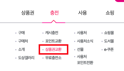 3. 상단 카테고리에서 충전 > 상품권교환 클릭