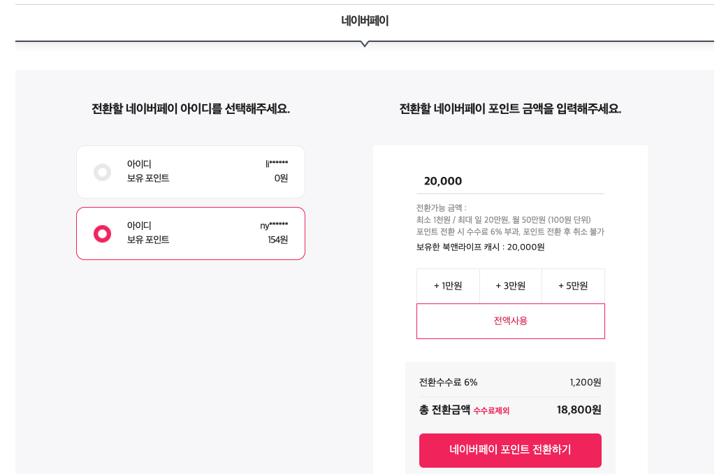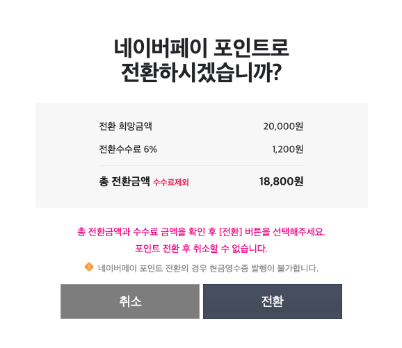 도서상품권을 네이버페이로 전환하면 수수료 6%를 떼어갑니다. 저는 20,000원 중에 전환수수료 1,200원을 제외하고 18,800원을 받았습니다.