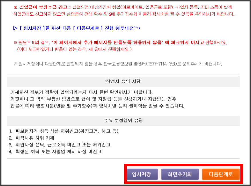 위에 정보를 모두 확인하였으면 임시저장을 누르고 다음 단계로 넘어갑니다. 그리고 실업인정일 날 전송 버튼을 클릭하면 끝!