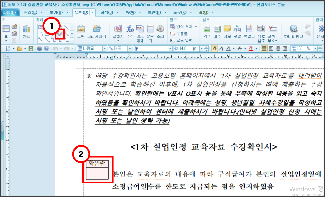 첨부2~4 저장하고 한글 파일을 엽니다. 상단에 입력을 누르면 연필 모양의 개체가 나옵니다. 클릭하고 확인란 및 서명란에 체크하고 저장해주세요.