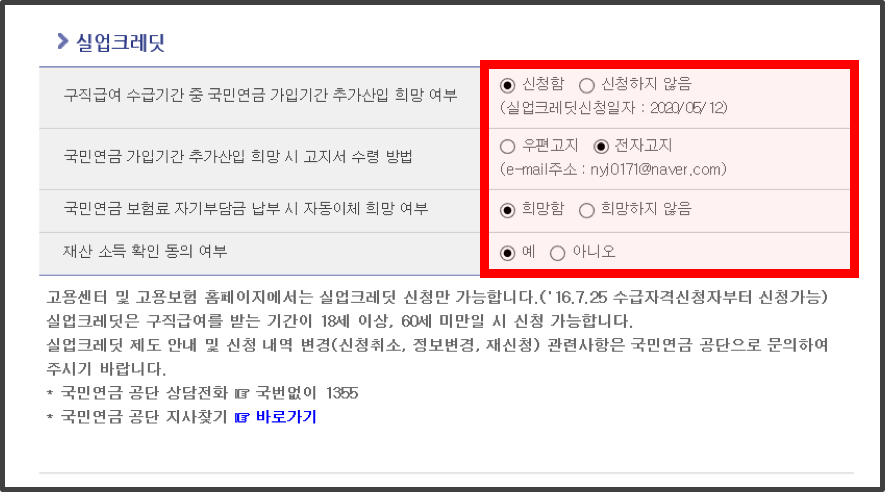 고용센터에 신청하러 간 날에도 실업크레딧 신청 여부를 확인하는데, 그때 하지 못했더라도 여기서 다시 신청할 수 있습니다.