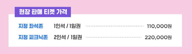 공연 전날까지 티켓을 구입하지 못했다면? 현장에서도 구매해서 입장할 수 있습니다. 다만, 현장 판매 티켓은 가격이 좀더 비싸집니다. 지정좌석은 110,000원 , 지정피크닉존은 220,000원이네요.