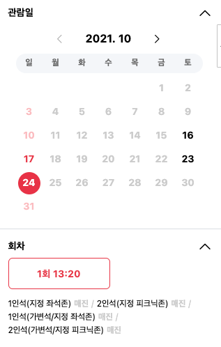 아래 사진을 보시면 인터파크(왼쪽 사진) 티켓은 10월 24일 전좌석 매진, 같은날 위메프(오른쪽 사진)는 가변석 1인석 및 2인석 피크닉존 모두 남아있는 걸 확인할 수 있습니다.