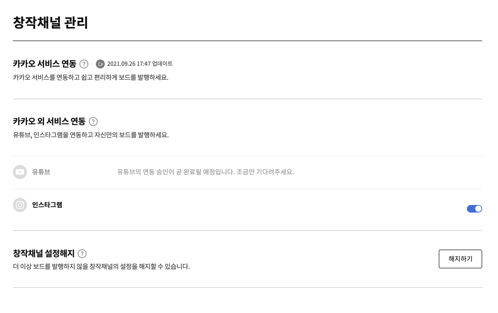기존에 가지고 있는 창작채널을 연동해주면 됩니다. 첫번째에 있는 카카오 서비스 연동에는 티스토리, 브런치, 카카오TV, 다음뉴스가 해당되며 카카오 외 서비스에는 유튜브와 인스타그램이 포함됩니다. 유튜브는 아직 연동 준비 단계에 있다고 합니다.