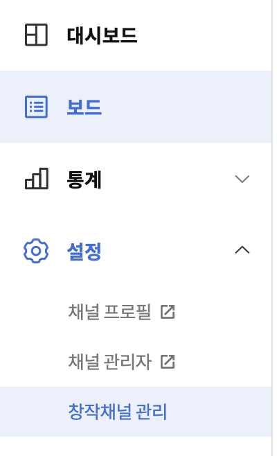 채널연동이 완료되었다면 다시 왼쪽 카테고리에서 보드를 클릭해줍니다. 그 다음에 '보드만들기'로 가주시면 됩니다.