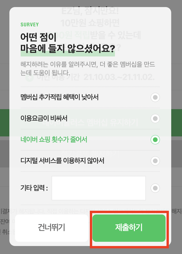 7. 해지이유 선택 후 제출하기 or 건너뛰기 클릭