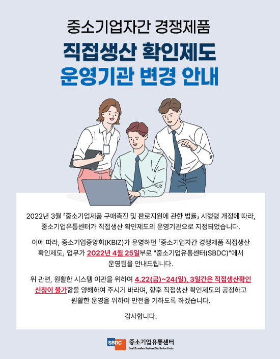 최근에 직접생산 확인제도 운영기관이 중소기업중앙회에서 중소기업유통센터로 변경되었습니다. 운영기관만 바뀌었을 뿐 직접생산증명서 신청과 기타 업무절차는 SMPP에서 동일하게 진행됩니다.