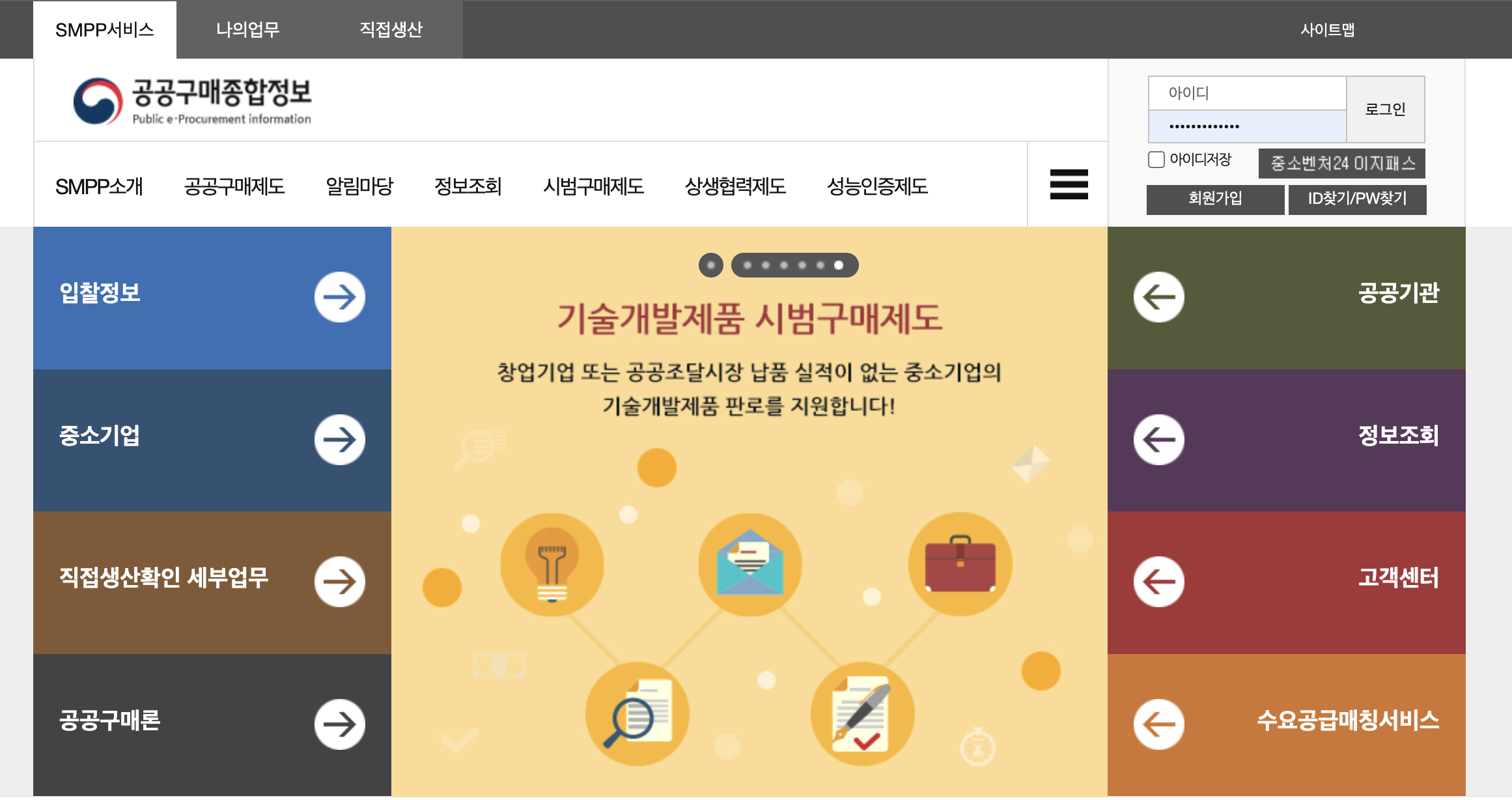 공공구매종합정보 smpp 홈페이지입니다. 메인에서 입찰정보, 중소기업 관련 증명서 발급, 직접생산 업무 등이 있습니다. 회원가입 후 서비스를 이용할 수 있습니다.