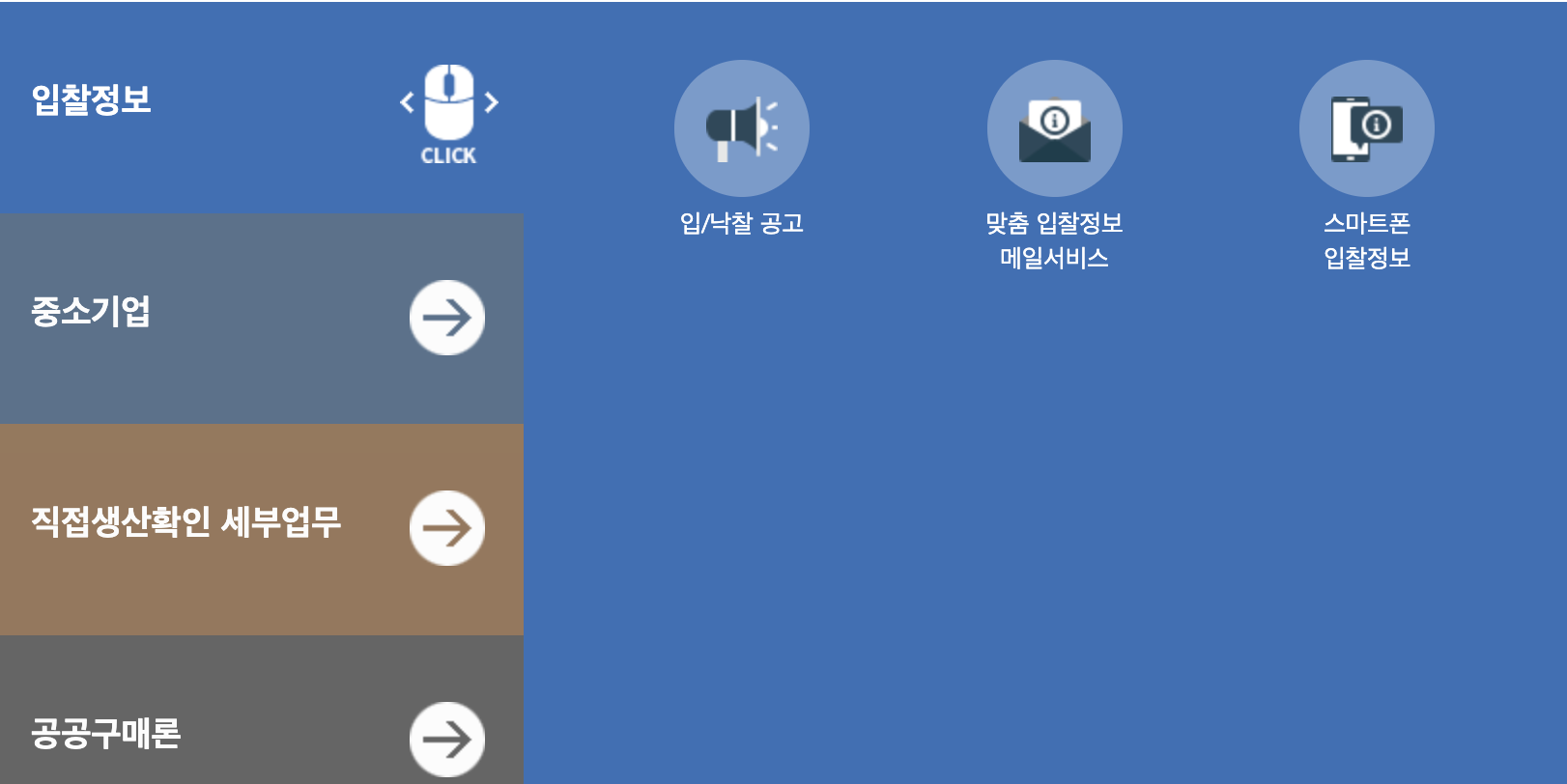 첫 번째에 있는 입찰정보에는 입/낙찰 공고, 맞춤 입찰정보 메일서비스, 스마트폰 입찰정보가 있습니다. 공공기관에서 입찰하는 공고는 나라장터에서 확인하는 경우가 많기에 자주 사용하는 메뉴는 아닙니다.