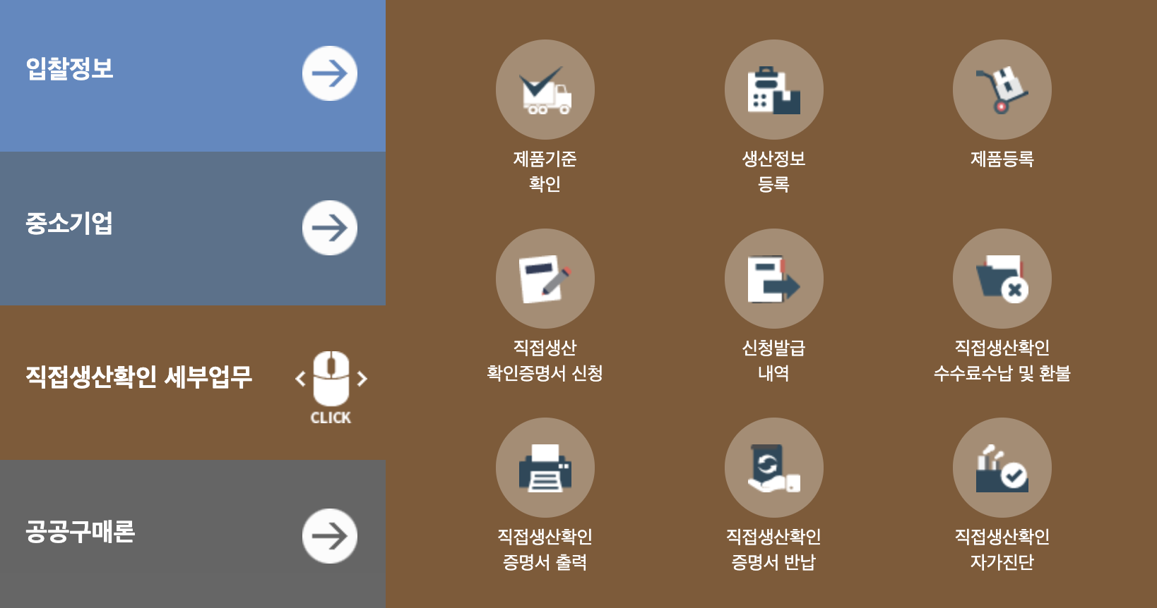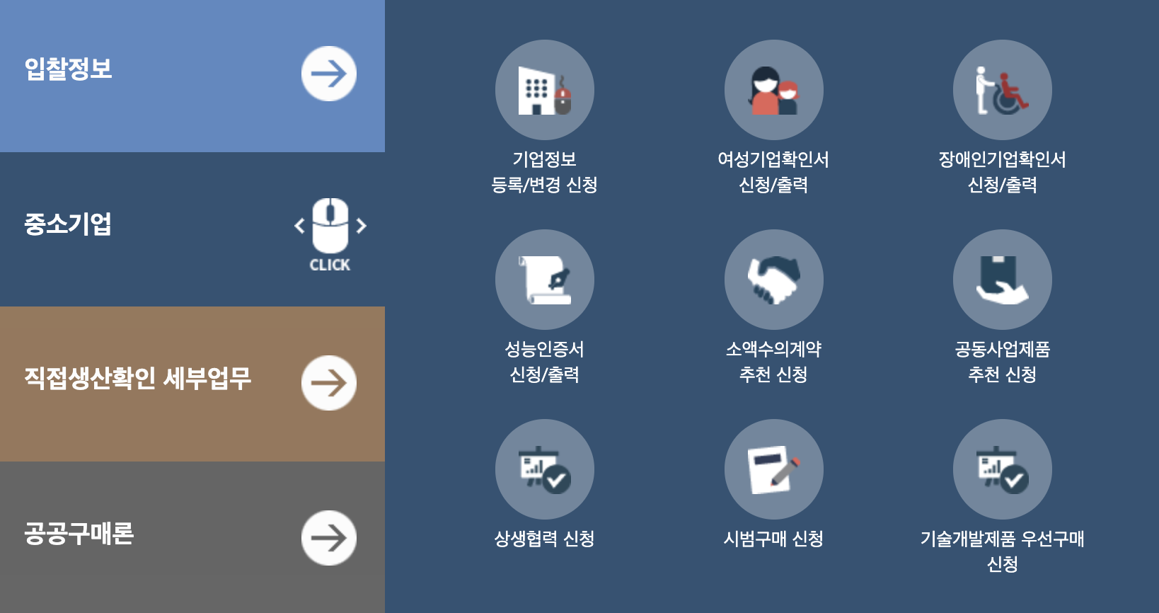 중소기업에는 유용한 서비스가 많이 있습니다. 직접생산확인 증명서를 발급하기 전에 '기업정보 등록/변경 신청'을 진행해야 하고, 여성기업확인서, 장애인기업확인서 등 증명서를 이곳에서 출력할 수 있습니다. 중소벤처기업부에서 발급하는 중소기업 확인 증명서도 출력할 수 있습니다. (*중소기업 확인서 신청은 홈택스에서 가능합니다.)