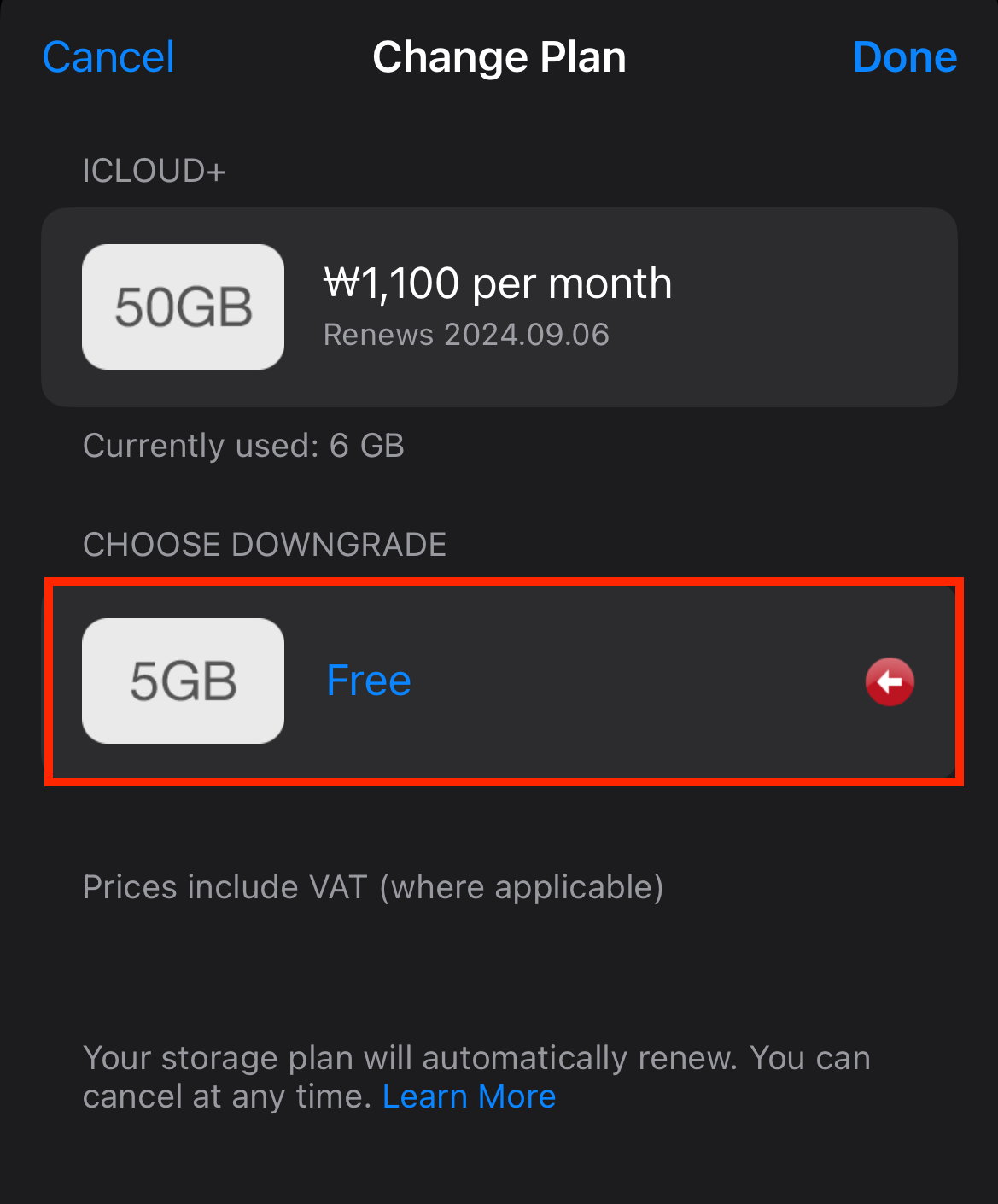 7. 가장 하단에 아이클라우드 다운그레이드 옵션이 있어요.