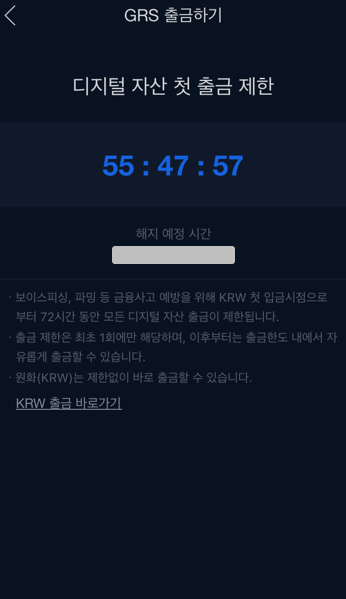 단, 주의할 점은 '출금하기'는 KRW 첫 입금시점부터 72시간 동안 제한됩니다.